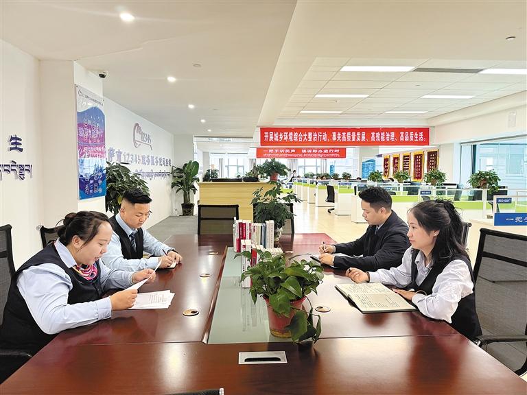 图为拉萨市行政审批和便民服务局工作人员对12345疑难工单进行讨论。