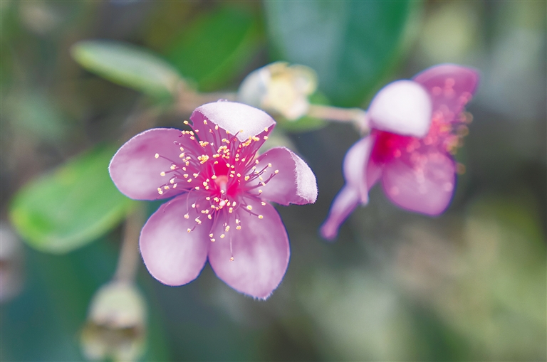 在海南乡野的坡地上,每到夏季,一株株灌木状的桃金娘,就会长出一朵朵粉白相间形似裙摆的花。凑近一看,在花瓣形成的包围圈里,花丝顶部的黄色花药好似点缀夜空的繁星,又如皇冠上的珠宝。当山风轻抚花瓣,花蕊也随之轻轻颤动,空气中飘着淡淡的香味。