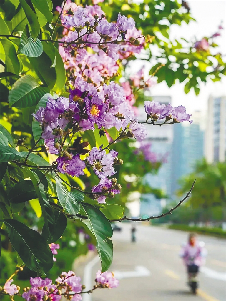 在海口西海岸的绿化带里,你可以看到一种叫大花紫薇的植物,它也是紫薇属,是毛萼紫薇的“近亲”。大花紫薇每年5月前后开花,簇拥状的花朵为淡红色或紫色,相比其他紫薇花,它的花型更大,花瓣更舒展,花瓣边缘自然蜷曲,像舞者的裙摆。它的花一直开到7月,花期持续约100天,因而也有老百姓叫它“百日红”。
