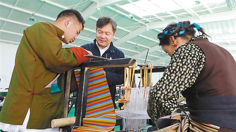 谢通门县珠峰牛羊示范合作社内工人正在编织氆氇。