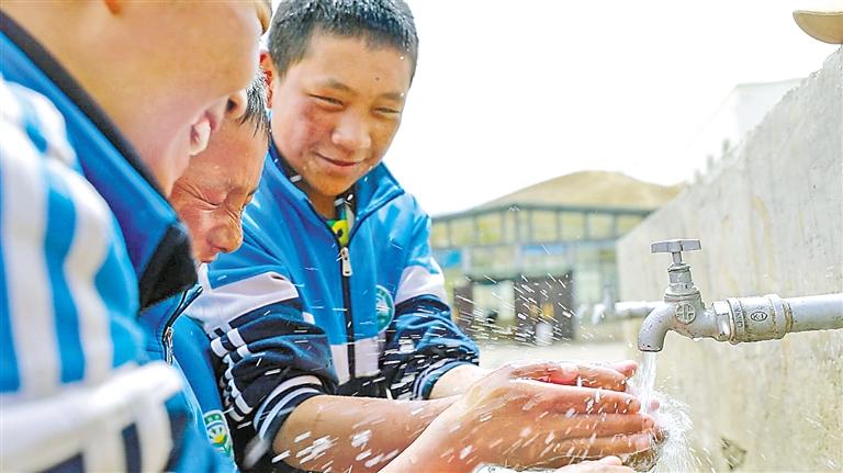 谢通门县县城自来水管网升级改造后,学生用自来水洗手。