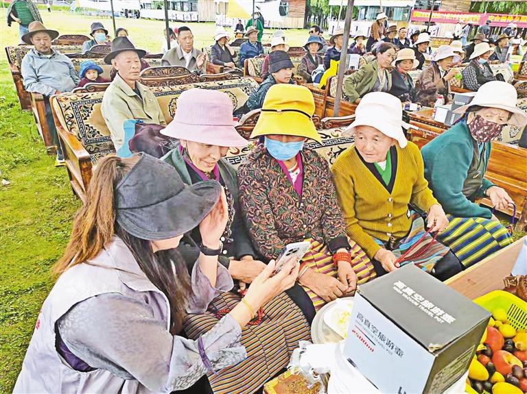 图为在山南市乃东区结莎街道嘎玛庆社区联合红星等三个社区举办的“长寿宴”活动中,工作人员为老人讲解如何使用智能手机。