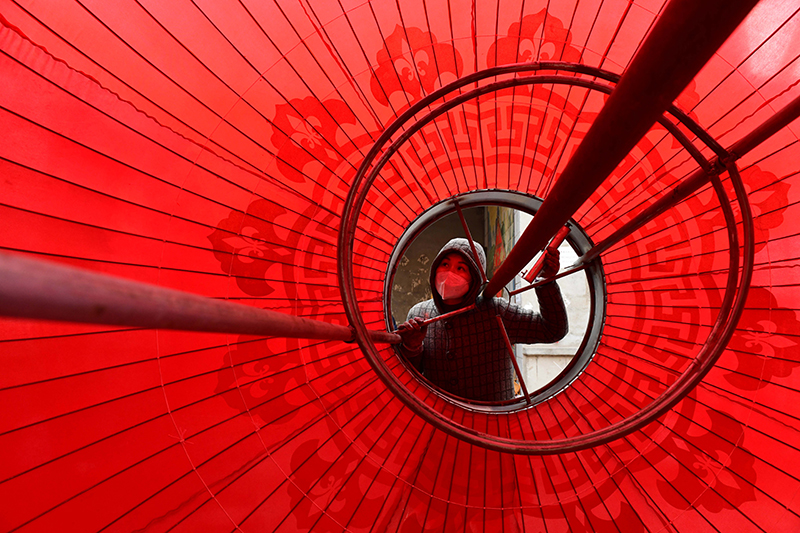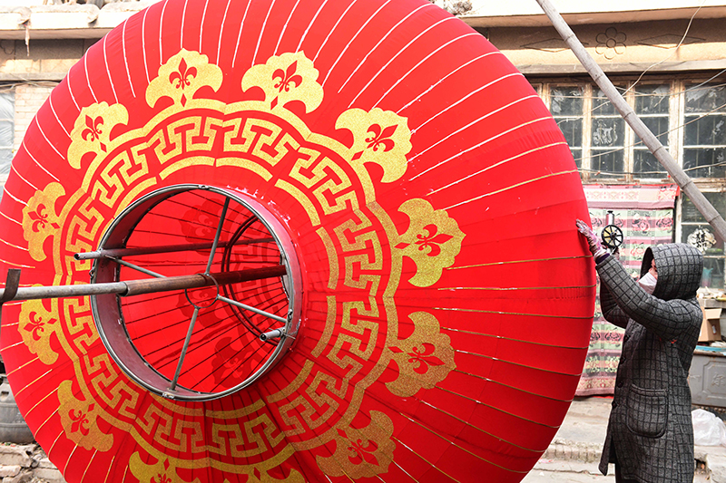 1月5日,在河北省石家庄市藁城区屯头村,一家宫灯企业的工人制作大型宫灯。
