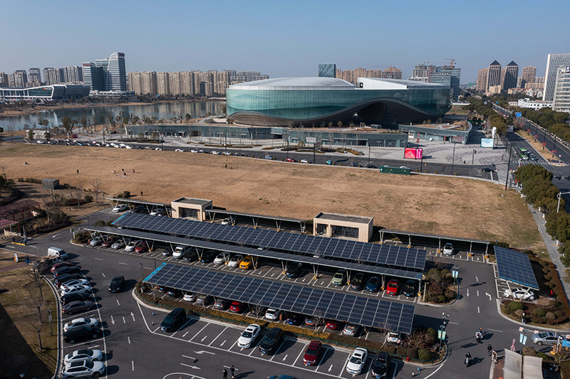 这是嘉兴市秀洲区秀湖公园的“光伏车棚”,这里的光伏车棚总装机量达466千瓦,年发电量约45万度(1月10日摄,无人机照片)。