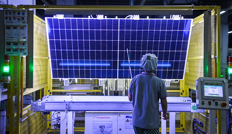 1月10日,在位于嘉兴秀洲光伏小镇内的一家科技有限公司,工人在查看刚生产出来的光伏设备组件。