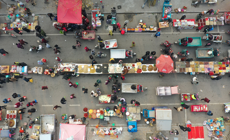 1月12日,人们在金井乡的年集上采购商品(无人机照片)。