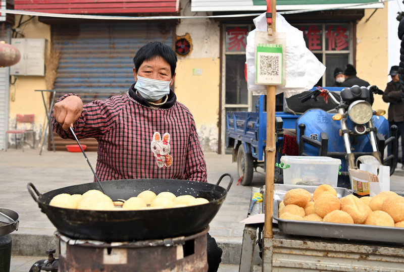 1月12日,一名摊主在金井乡的年集上炸芝麻球。