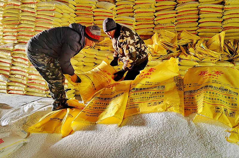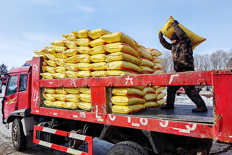 2月16日,北大荒集团五大连池农场科技服务中心工人在装运肥料。