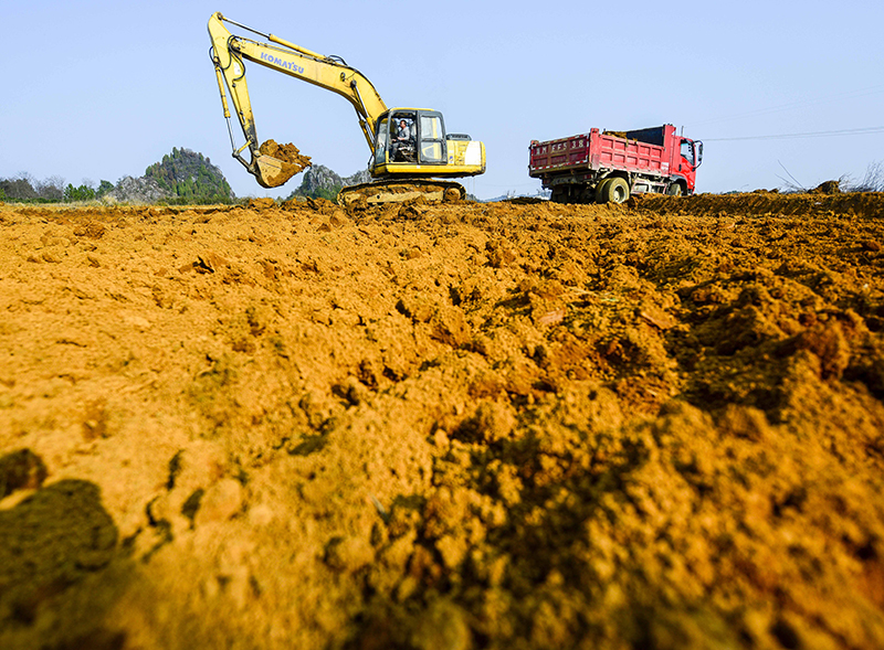 2月16日,在湖南省永州市道县寿雁镇芽洞村,工人驾驶挖掘机在高标准农田建设项目现场施工。