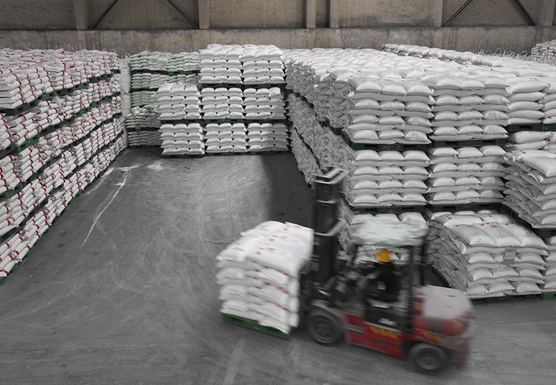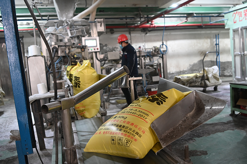 2月16日,在贵州省贵阳市开阳县一家化肥生产企业,工人驾驶叉车转运准备外销的化肥(无人机照片)。