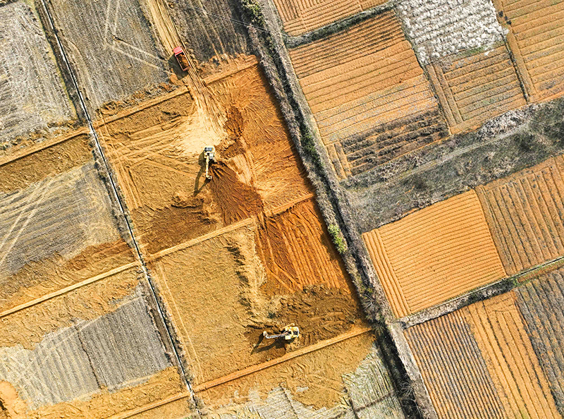 2月16日,在湖南省永州市道县寿雁镇芽洞村,工人驾驶挖掘机在高标准农田建设项目现场施工(无人机照片)。