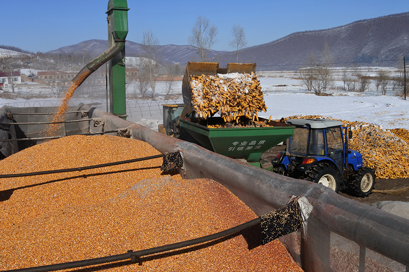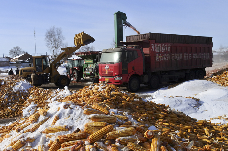 2月15日,在黑龙江省牡丹江市林口县刁翎镇三家子村,农民利用设备将玉米脱粒,为春耕做准备。