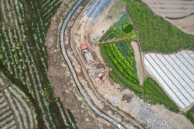 2月16日,在浙江省台州市仙居县双庙乡,工人在水渠及机耕道路施工现场施工(无人机照片)。