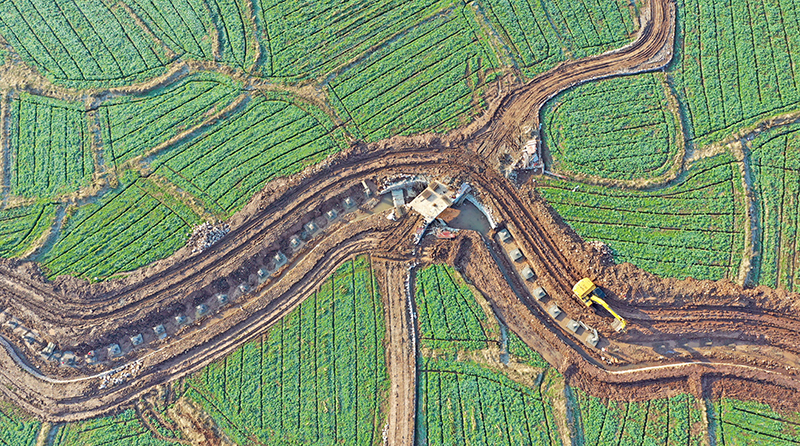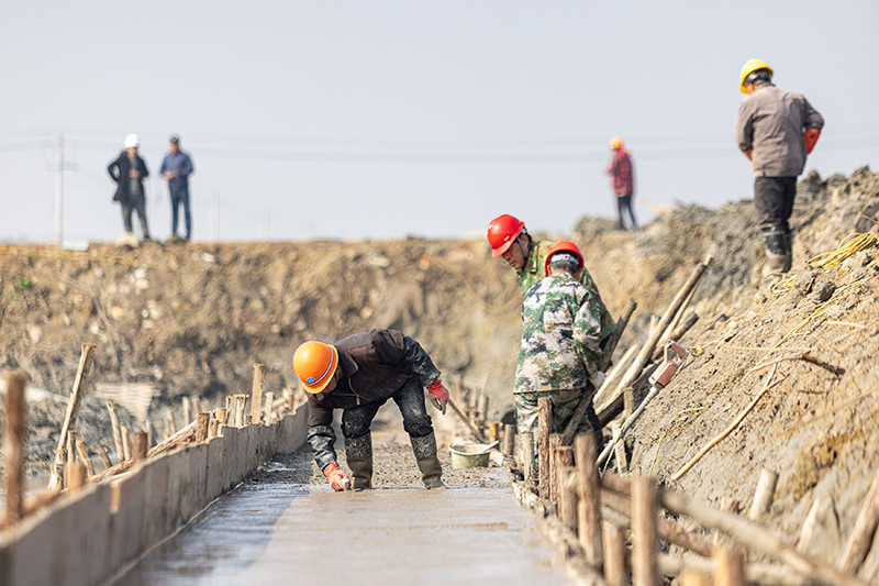 2月16日,工人在浙江省湖州市长兴县虹星桥镇修建水渠。