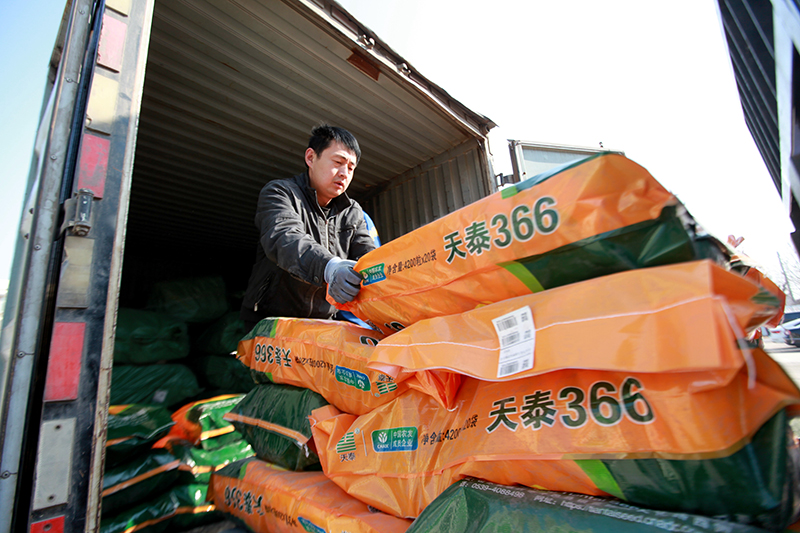 2月16日,在山东省临沂市平邑县一家种业公司,工人将玉米种装车外运。