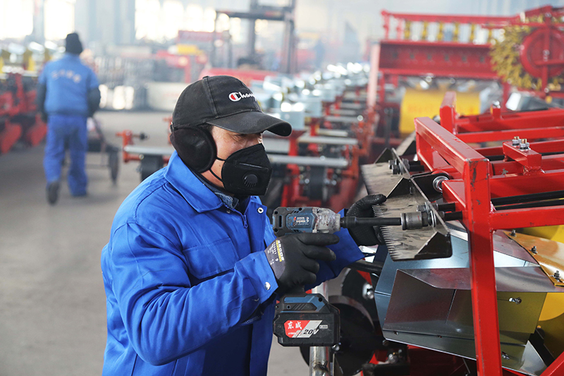 2月16日,在甘肃省定西市一家农机制造企业,工人在组装农机。