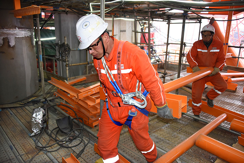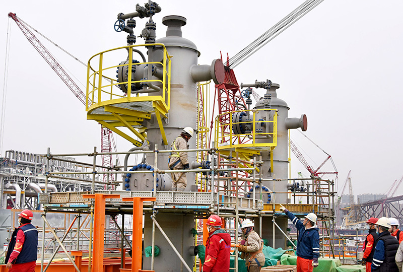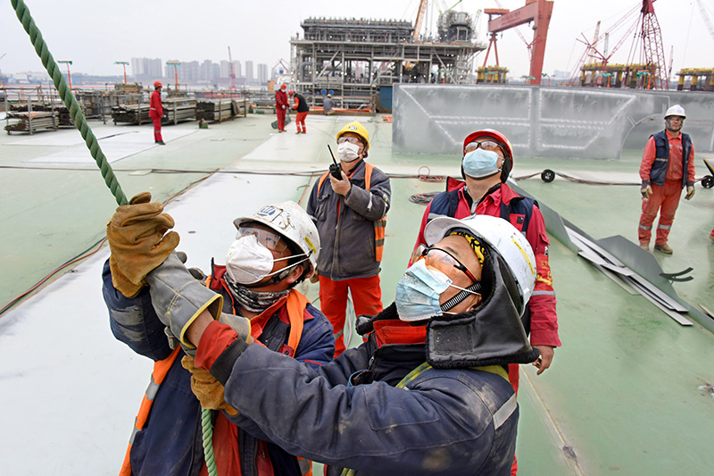 2月22日,工人在渤中19-6凝析气田一期CEPA(中心处理平台)组块建造现场进行施工作业。