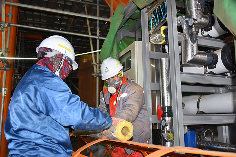 2月22日,工人在渤中19-6凝析气田一期CEPA(中心处理平台)组块内进行管线安装作业。