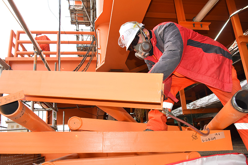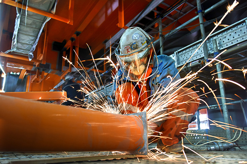 2月22日,工人在渤中19-6凝析气田一期CEPA(中心处理平台)组块建造现场进行打磨作业。