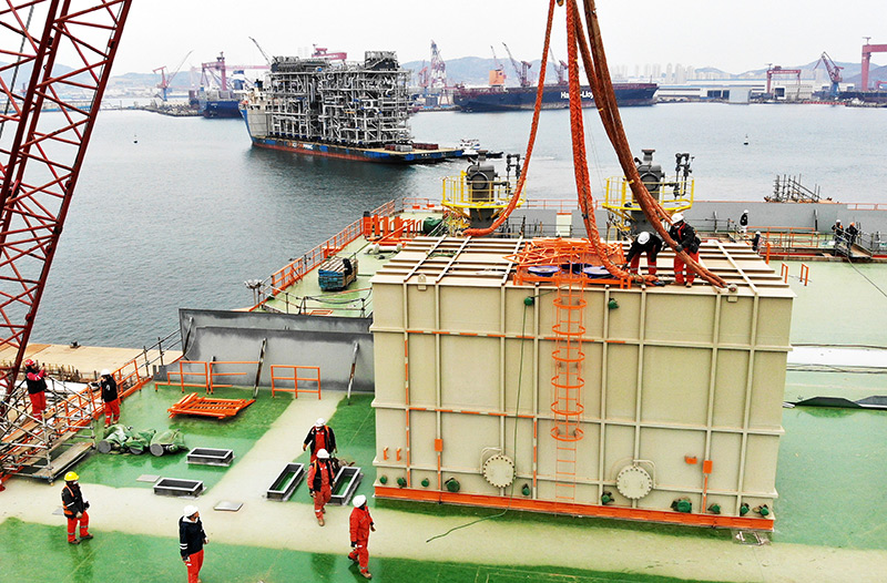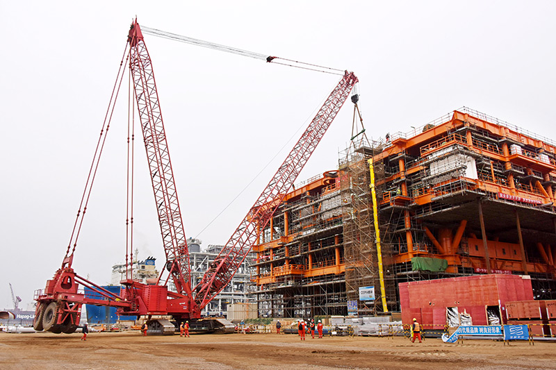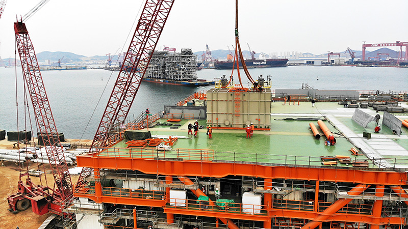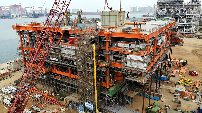 2月22日,渤中19-6凝析气田一期CEPA(中心处理平台)组块建造现场正在进行吊装作业。
