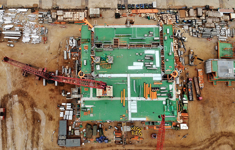 这是正在建造中的渤中19-6凝析气田一期CEPA(中心处理平台)组块(2月22日,无人机照片)。