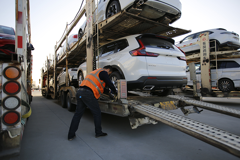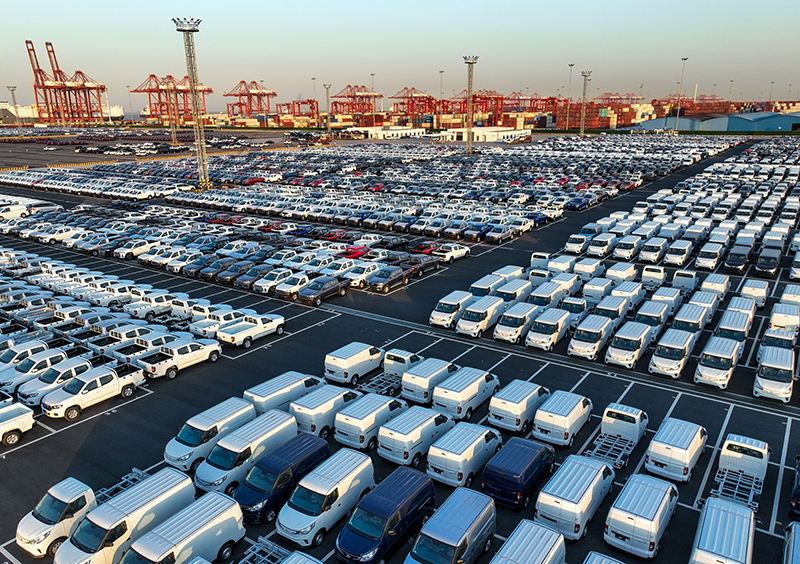 3月13日,工作人员在江苏太仓港海通汽车码头堆场作业。