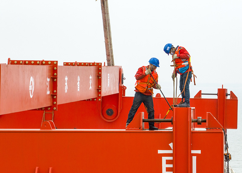 3月20日,中交二航局建设者在常泰长江大桥主航道桥泰州侧施工现场安装吊具(无人机照片)。