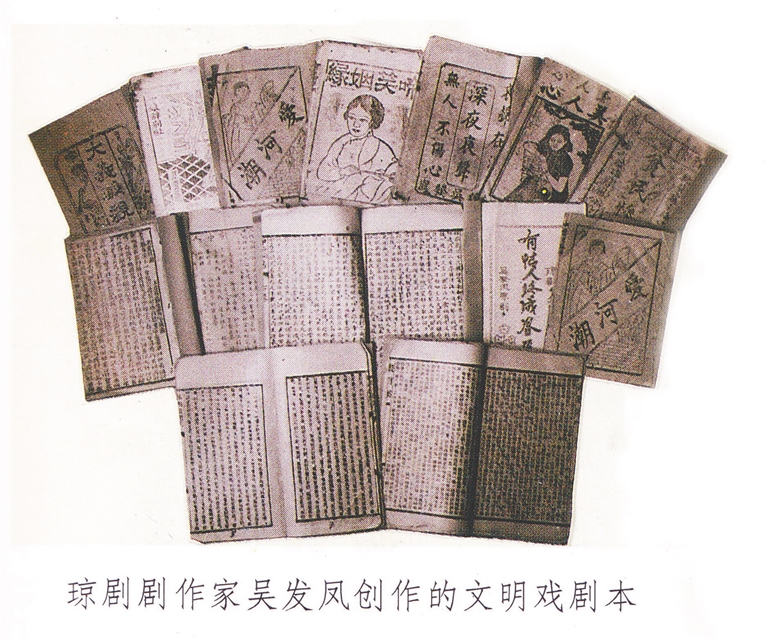 万州(今万宁)土戏男旦庆寿兰,早年创建琼顺班,因编演讽刺慈禧太后的《颐和园》《北洋狗》,遭到当局悬赏缉拿,被迫流落星洲,与黄瑞兰等艺人创办集演戏、编戏和教戏于一体的“星洲剧社”;会同(今属琼海)武生卢彩文,光绪初年在南洋跟广府班(粤剧)学戏,是琼班“科白”戏改唱“梆黄”曲调的先驱,懂得吐火吞火、空中飞人、耍弄飞刀等技巧,运用到《火牛破甲兵》《秋香过岭》等剧目,在南洋各地演出引起轰动,华侨赠以“武冠五洲”匾额。他常对年轻艺人说“发无苍白艺不精”,八十高龄了还演吐血周郎,观众称“八十小生”;民国十六年(1927年),因海南岛战乱,琼剧“开戏师爷”吴发凤(早期琼剧只按提纲演戏,没有剧本,吴发凤开始编文明戏脚本进行排演,因而得此尊称)也随班到南洋避难,虽然他在海外没有产生影响的琼剧演出,但他编写的一批土戏时装剧本《双自由》《林兰香弄嫂》《瓜寮成亲》《马伏波开琼》《继母泪》等,不断通过出洋旅演的戏班运往东南亚各地销售,并被当地戏班搬上舞台,在东南亚刮起演出“西装领带剧”热潮。