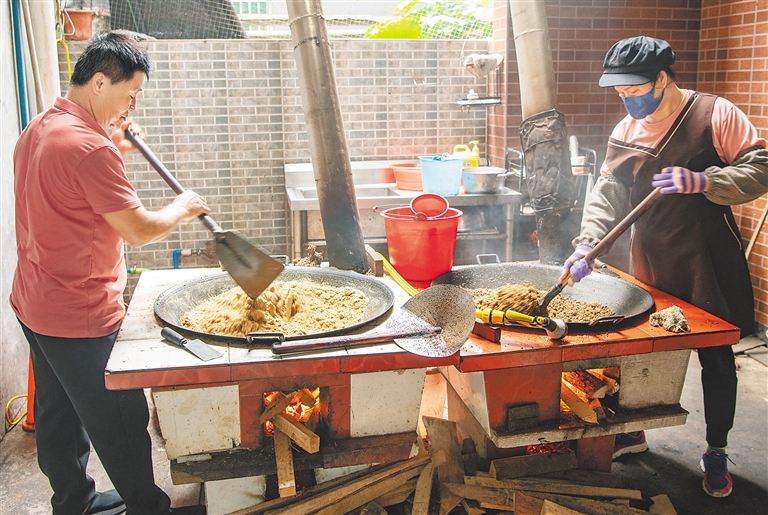 琼海阳江镇一家榨油作坊,工人在翻炒山柚籽。特约记者 蒙钟德 摄