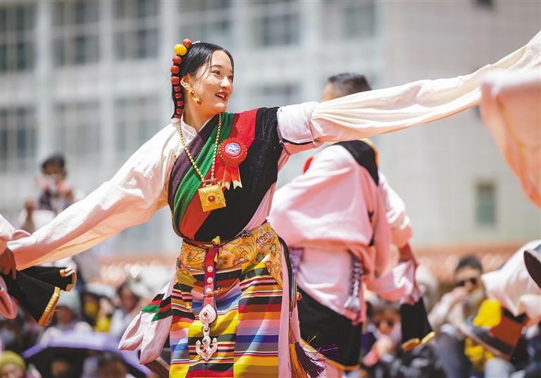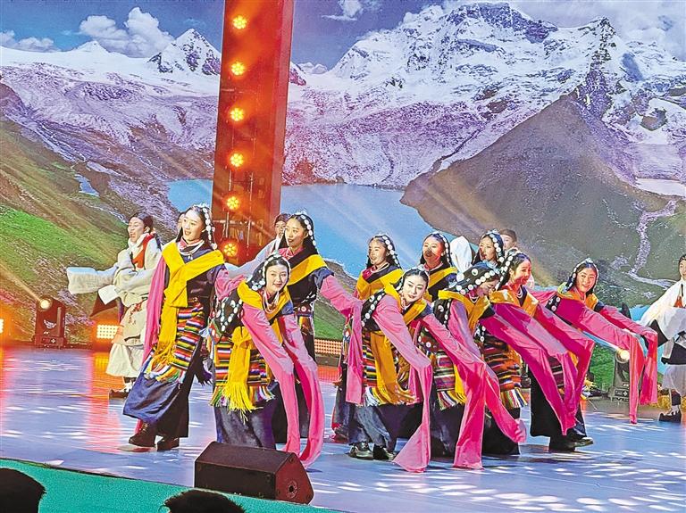 身着特色藏族服饰的巴青县群众在“乡村振兴 那曲奋进”传统舞蹈大赛上表演舞蹈。