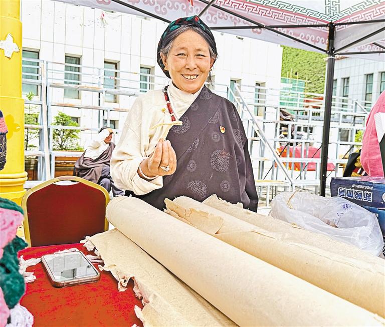 在那曲市“乡村振兴 那曲奋进”成果展上,比如县群众次仁卓嘎对外展示传统手工艺品——藏纸。