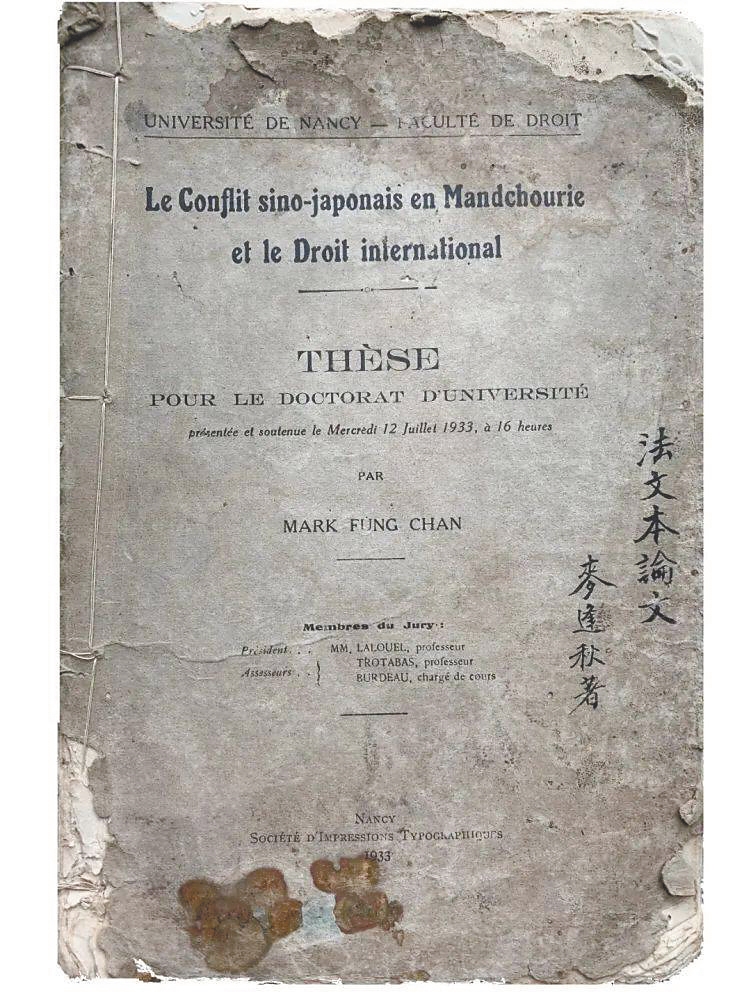 功夫不负有心人。1933年,麦逢秋以法文撰写的学术论文《论中日关系与国际公法》参加博士毕业答辩,获得了教授们的一致好评,通过了严苛的博士考核,荣获法学博士学位,一时誉满法兰西。